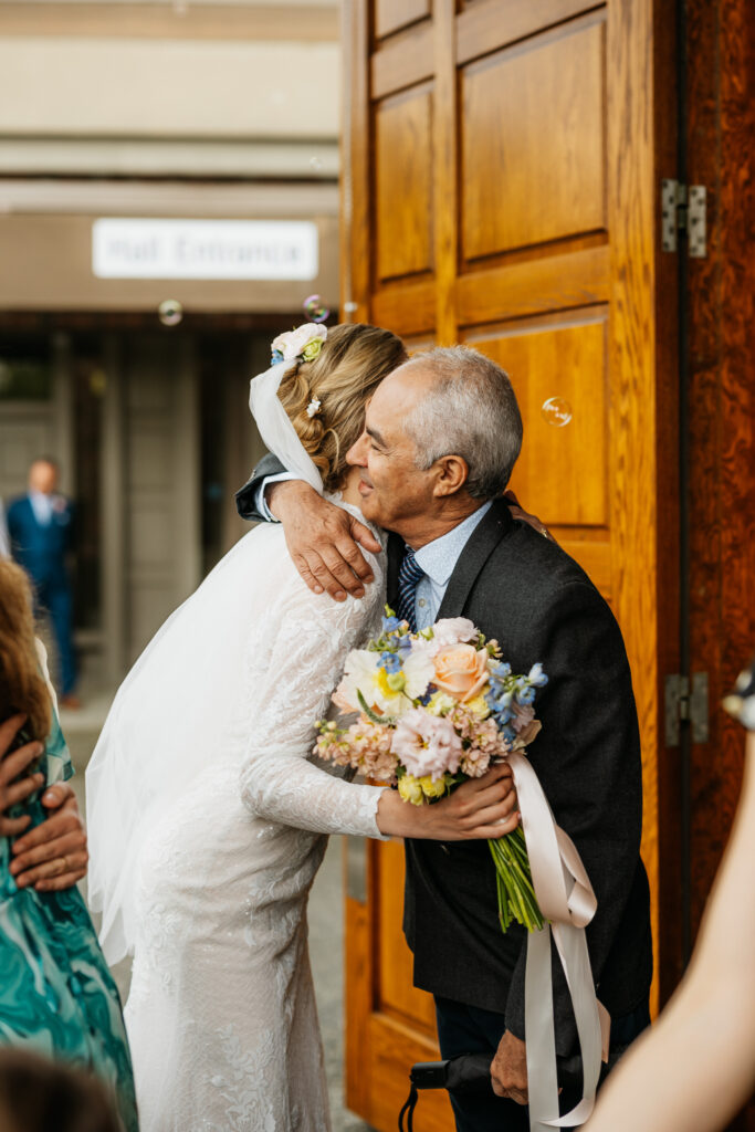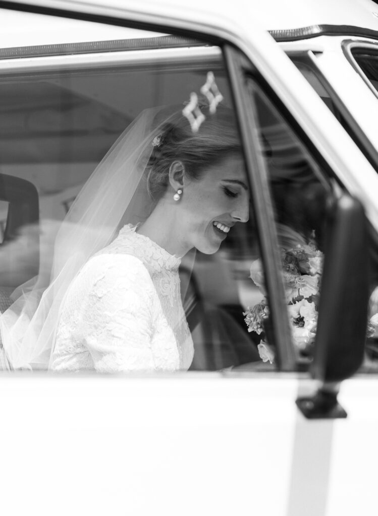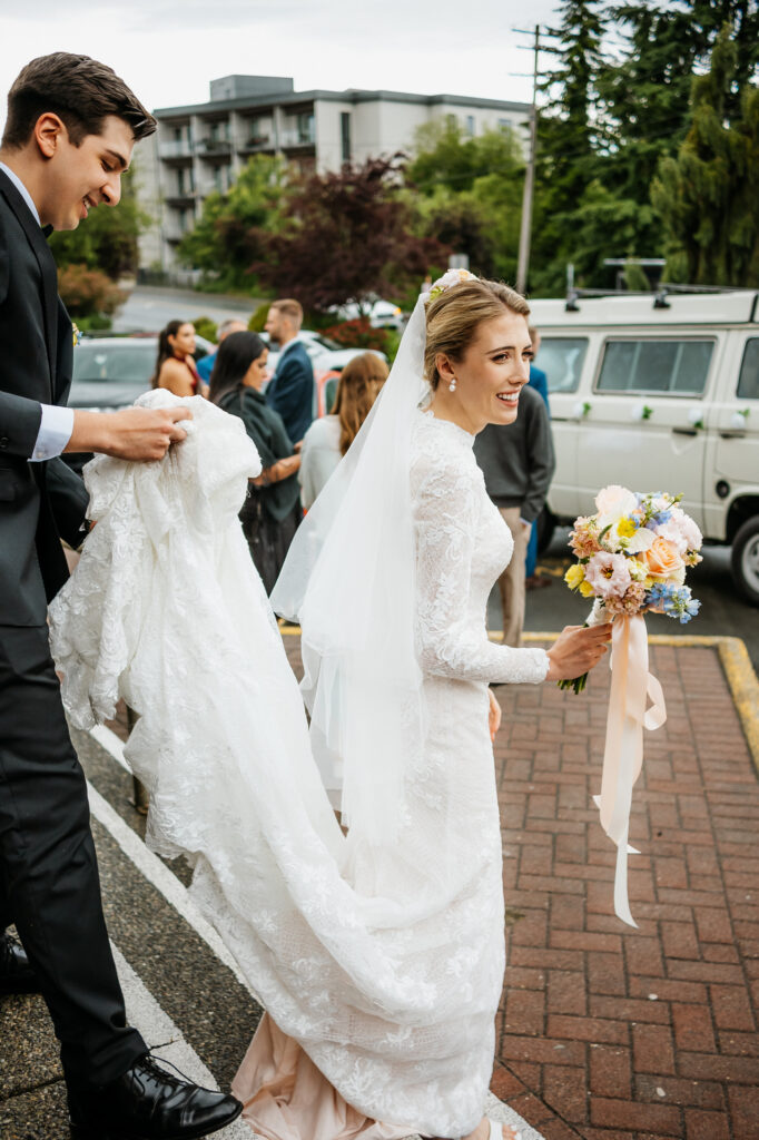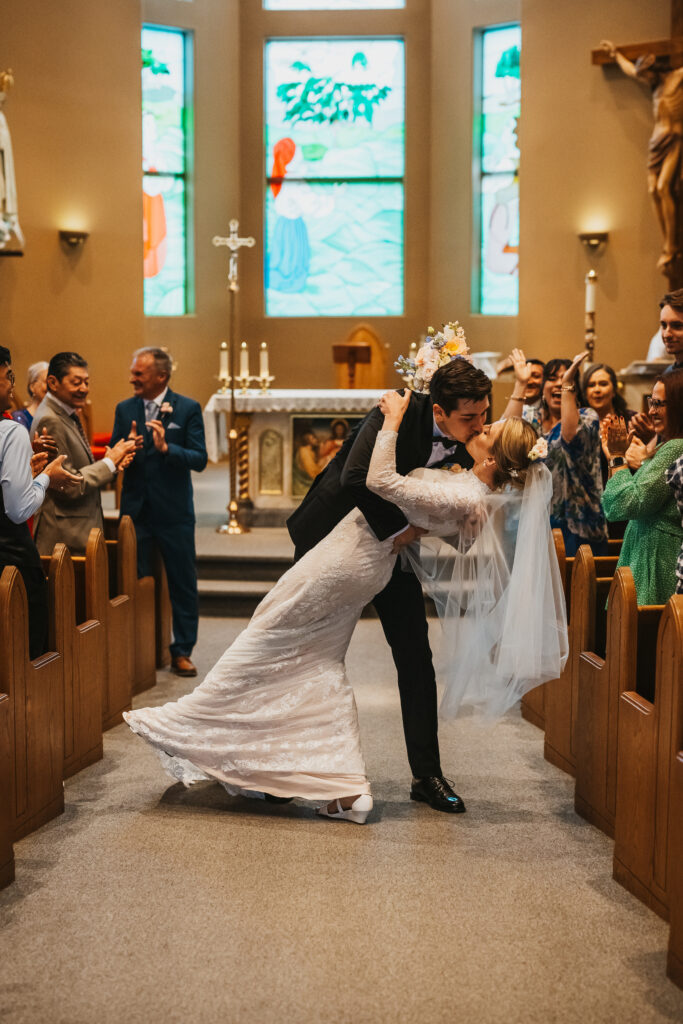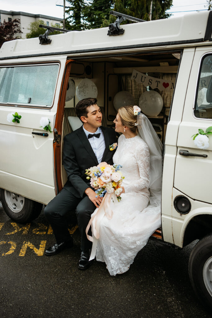 After the ceremony, Kira and Esteban stood at the front of the church, greeting their guests one by one. There was so much joy in the air as everyone embraced, shared congratulations, and celebrated the start of a beautiful new chapter. Once the last hugs were shared, Kira and Esteban made their exit in the most perfect way, a vintage Westfalia camper van. As a fellow Westy lover, I was beyond excited to see someone else who shares the same passion. The van adorned with white decor and a big ” just married” sign on the back. A truly fun, creative, and personal way to leave the ceremony.