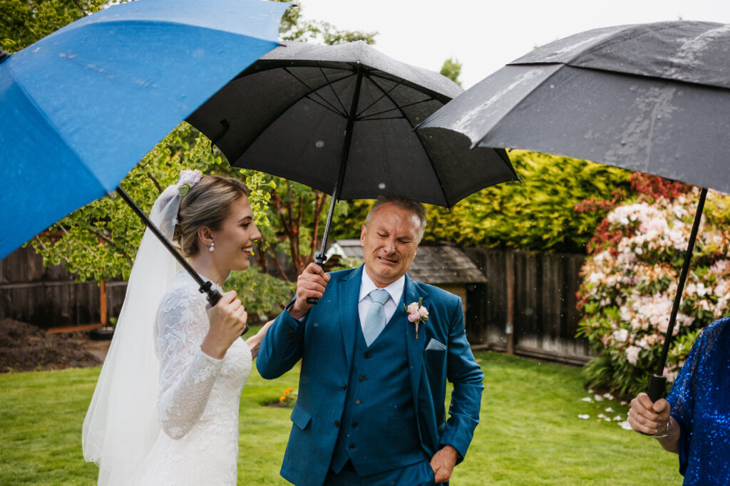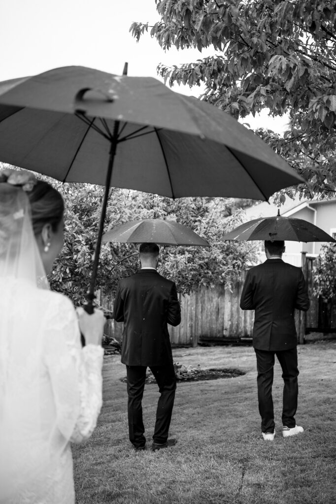 Outside, her family gathered in their quaint backyard, standing underneath umbrellas as soft rain gently drizzled around them. First, we captured a heartfelt first look with her mom and dad. Her father was over come with emotion, tears of joy filling his eyes as he saw his little girl all grown up. Her brothers waited patiently near by, and when it was finally their turn, they beamed with pride at how beautiful their sister looked.