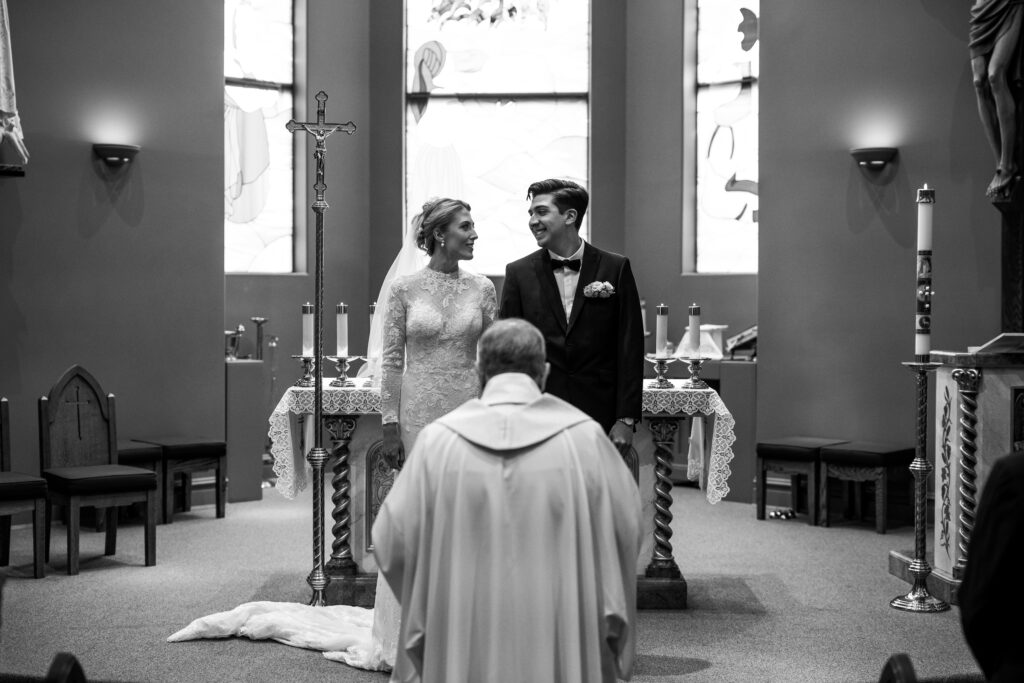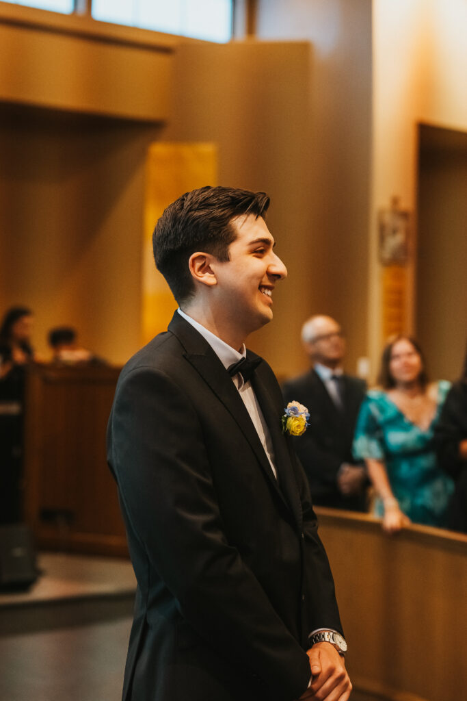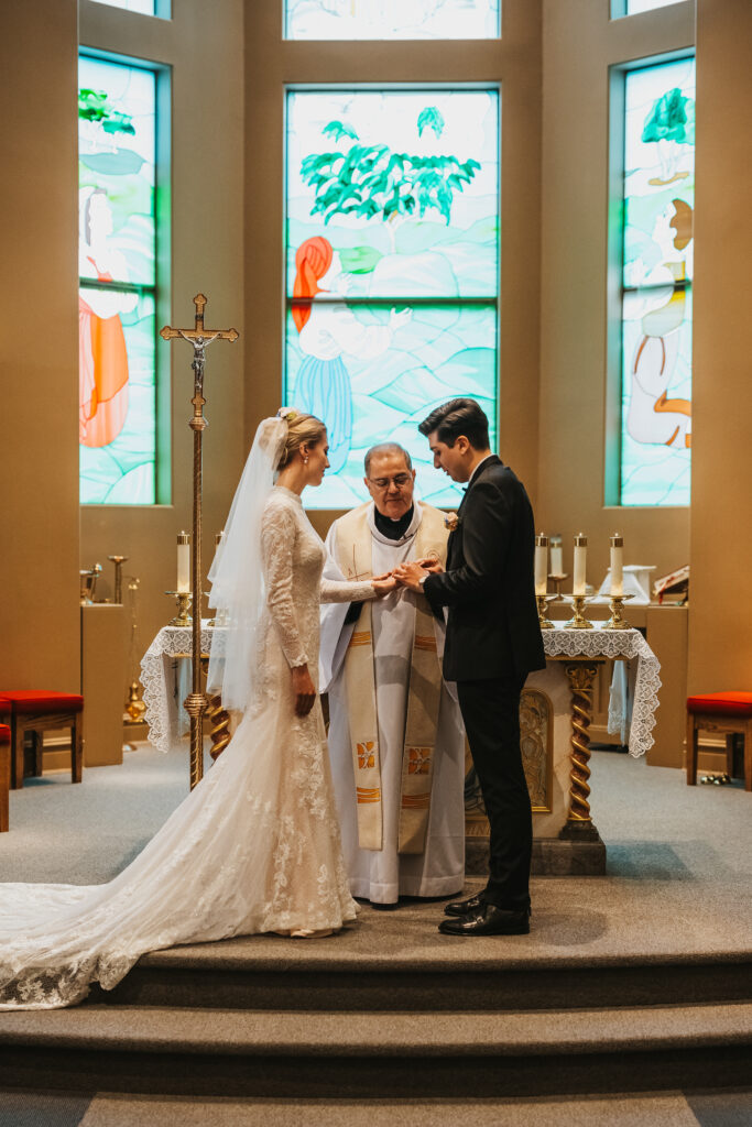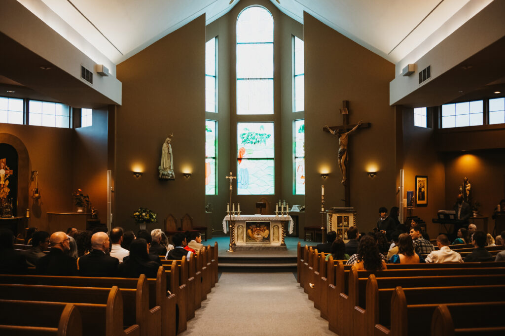 After leaving her home, I made my way to Our Lady Fatima Church, where Kira and Esteban held a beautifully intimate ceremony. The church was grand, with tall ceilings, rows of wooden pews, and a raised altar at the front. As guests began to fill the seats, a quiet excitement settled in the room, everyone eager to witness this special moment. When Kira walked down the aisle, Esteban’s face lit the room with pure love. He embrace her father warmly before taking Kira’s hand, and together they stepped forward, standing before their loved ones as the priest began the ceremony.