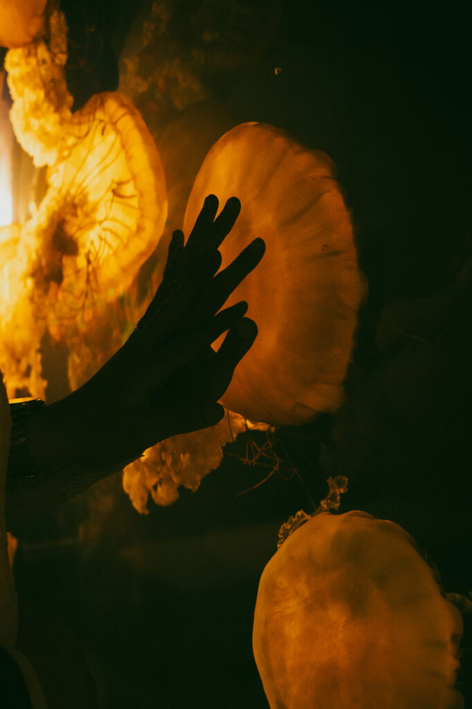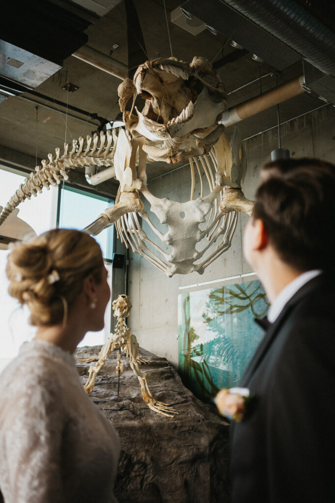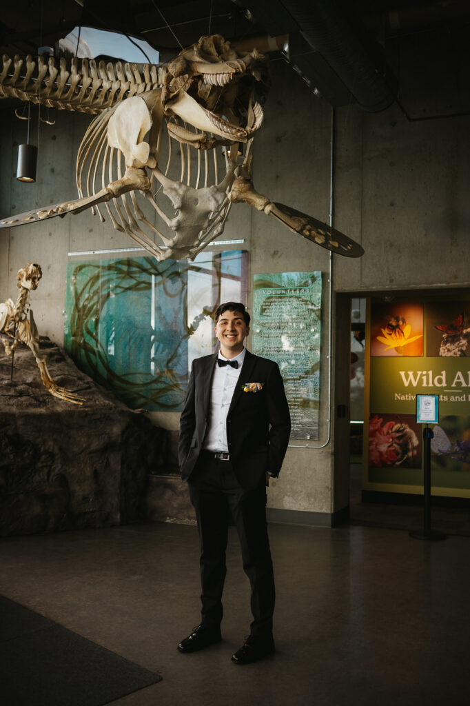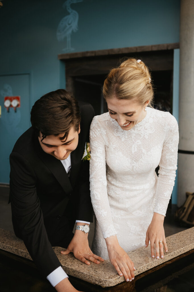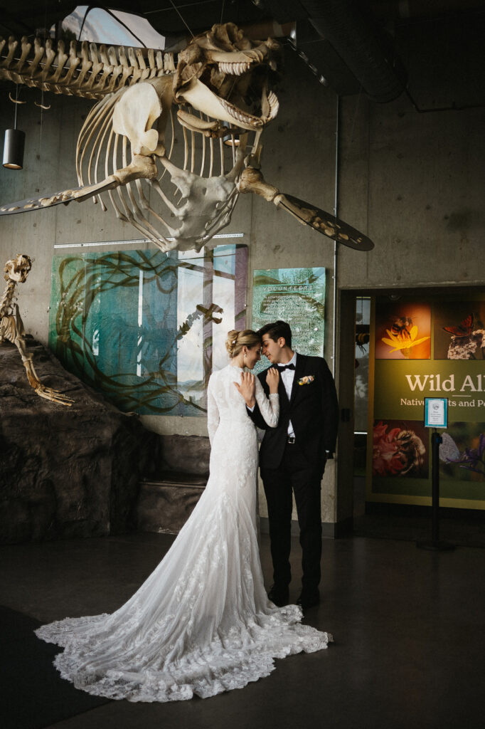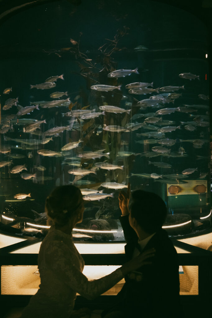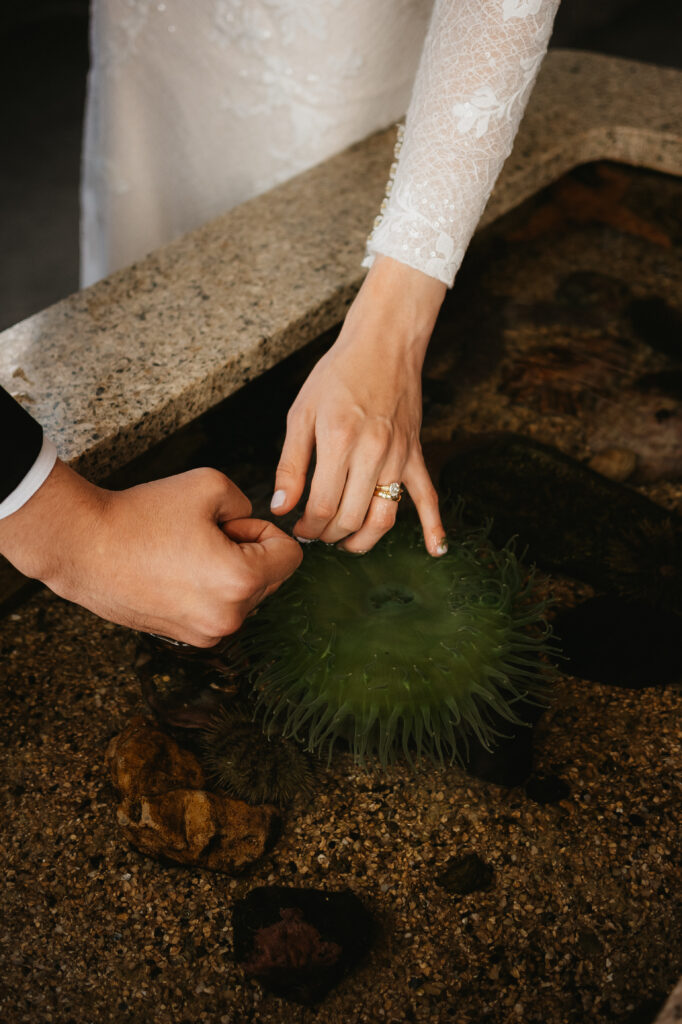 We wrapped up their portraits at Dominion park, and made our way down to one of my favorite parts of Kira and Esteban’s day, there session at the Salish Sea Aquarium. It was here that their personalities truly shined as they embraced their shared love for marine life, and then their playful, nerdy sides came out. Amid glowing tanks and swirling schools of fish, they shared quiet, intimate moments that felt straight out of a dream. I photographed them surrounded by jellyfish, watched tiny salmon fry dart through the water, then captured intimate moments together at the touch tank. It was the perfect blend of romance and wonder, uniquely them!