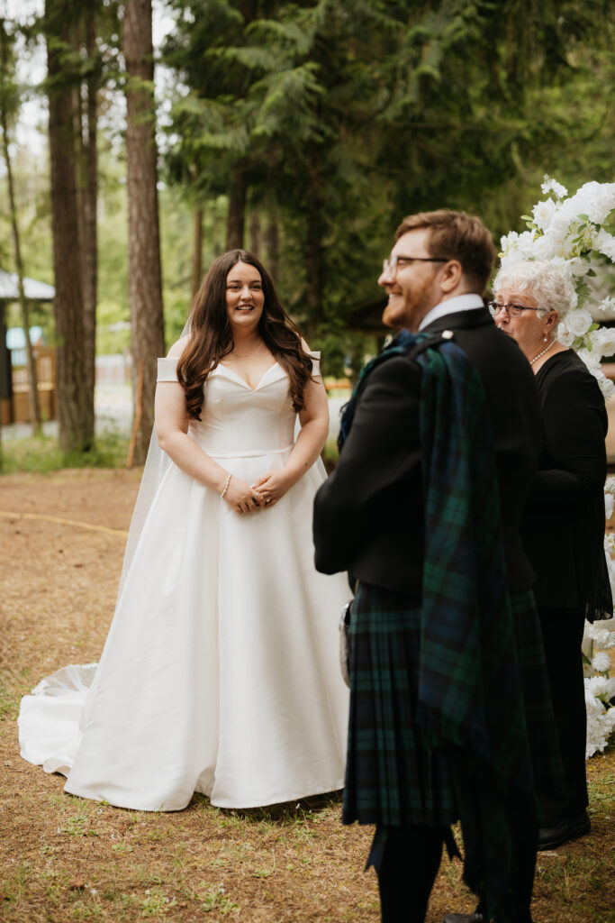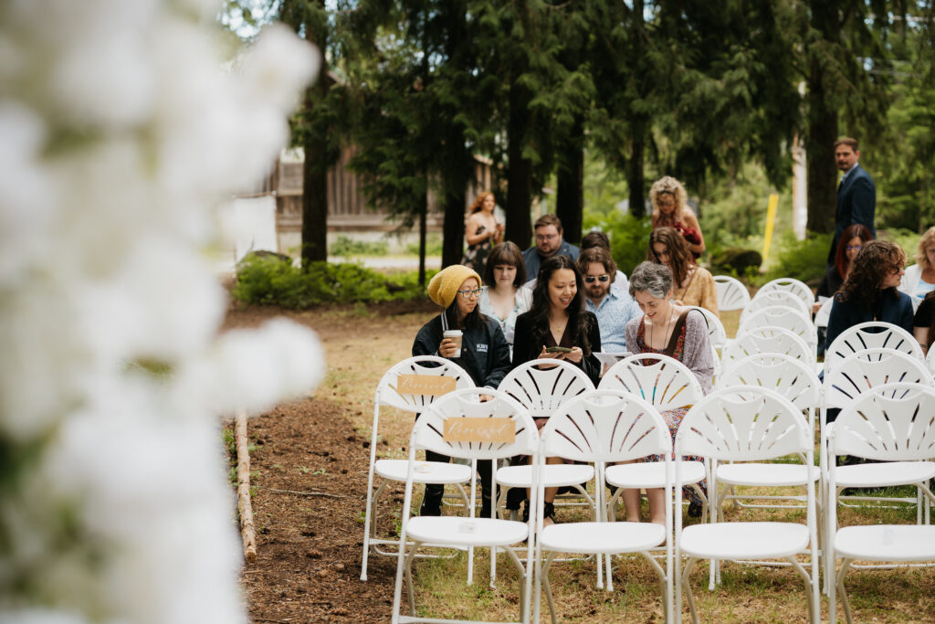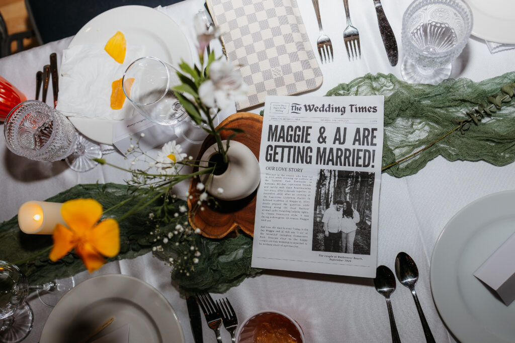 Soon the ceremony began, with each guest greeted by the sweetest little newspaper all about Maggie & Allen, something everyone loved reading as they waited for the celebration to start. Their ceremony was tucked away in the forest, on a soft grassy patch, with an arch that look as though it was pulled straight from Bridgerton. Adorned with delicate white flowers and surrounded by perfectly placed chairs, the whole scene felt timeless, romantic, and straight out of a fairytale.