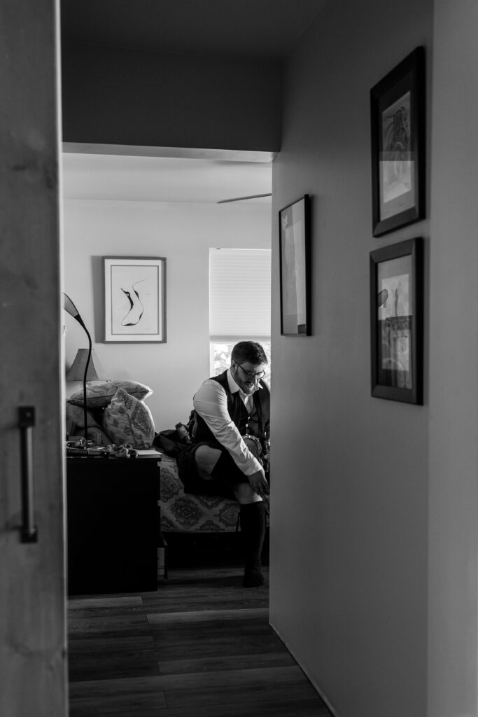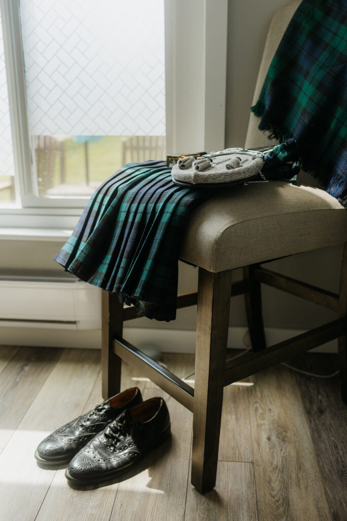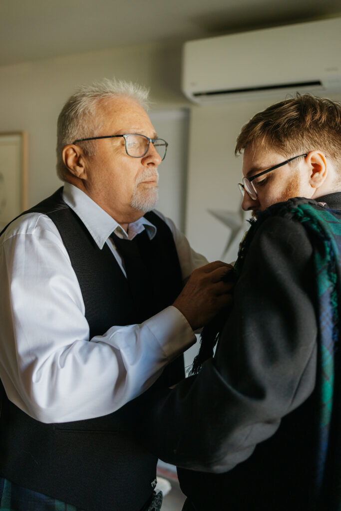 My first stop was capturing Maggie’s getting ready photos at her parents quaint and welcoming home, filled with warmth and excitement. Surrounded by her closest friends, the room buzzed with laughter and happy chatter as they did each others makeup, shared stories, and celebrated their beautiful bride-to-be. During this time, my second shooter joined Allen as he and the men got ready, proudly wearing their kilts and sharing the morning together. One of the sweetest moments was his dad gently help him get ready, a quiet exchange filled with tenderness, pride, and love as they prepared for such a meaningful day.